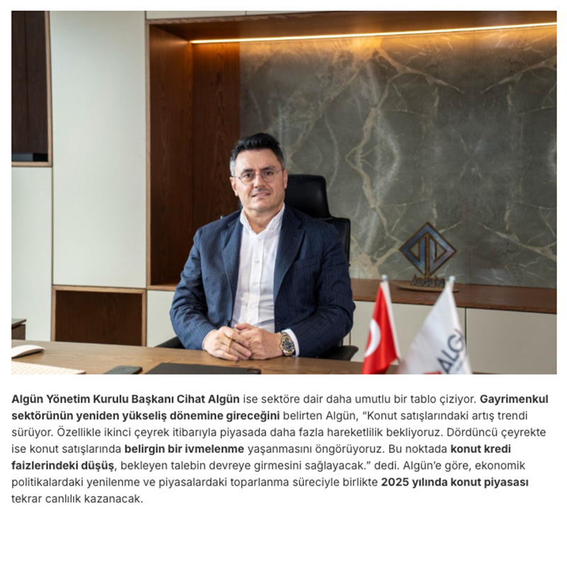 Algün Yönetim Kurulu Başkanı Cihat Algün ise sektöre dair daha umutlu bir tablo çiziyor. Gayrimenkul sektörünün yeniden yükseliş dönemine gireceğini belirten Algün, “Konut satışlarındaki artış trendi sürüyor. Özellikle ikinci çeyrek itibarıyla piyasada daha fazla hareketlilik bekliyoruz.