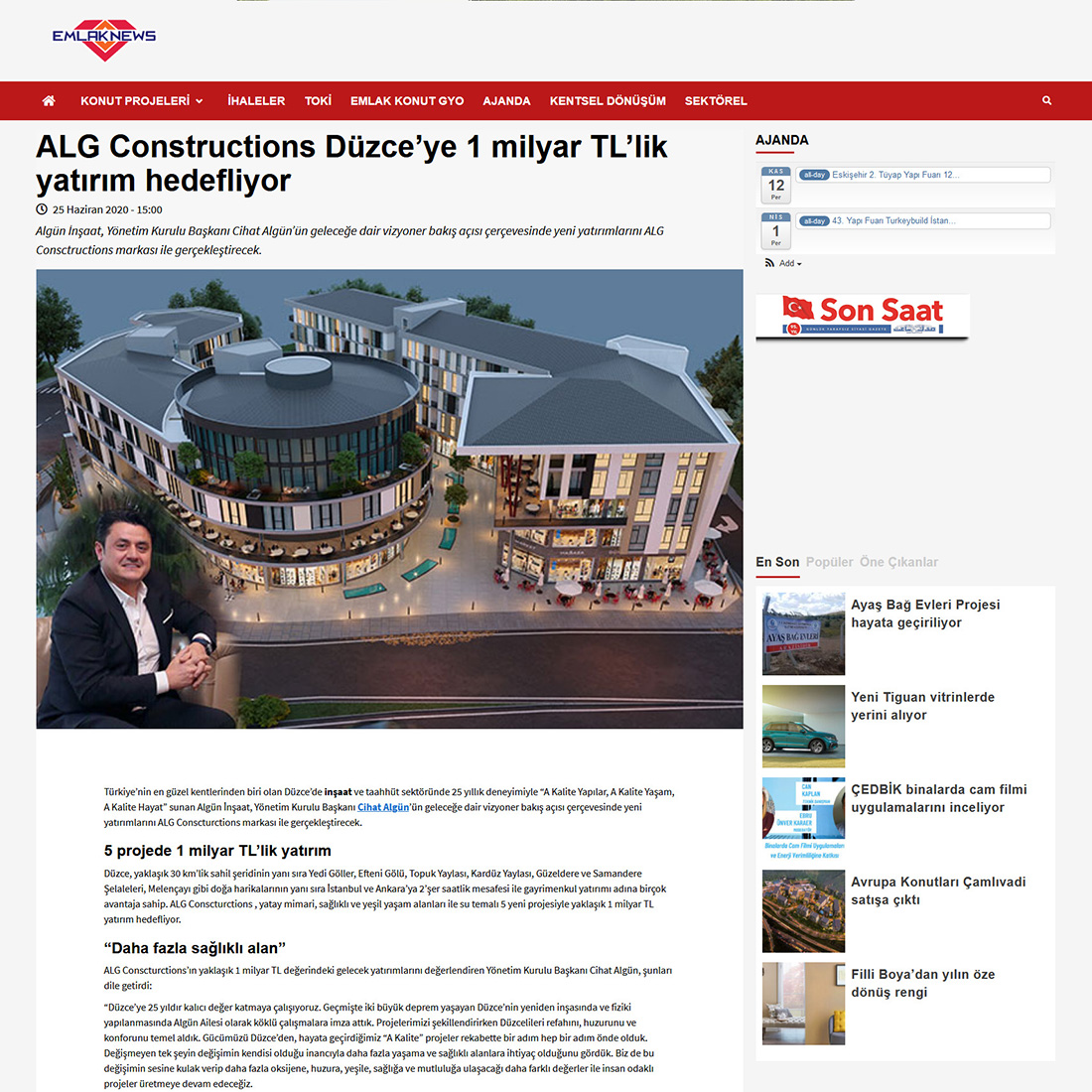 ALG Constructions Düzce’ye 1 milyar TL’lik yatırım hedefliyor Algün İnşaat, Yönetim Kurulu Başkanı Cihat Algün’ün geleceğe dair vizyoner bakış açısı çerçevesinde yeni yatırımlarını ALG Consctructions markası ile gerçekleştirecek. Türkiye’nin en güzel kentlerinden biri olan Düzce’de inşaat ve taahhüt sektöründe 25 yıllık deneyimiyle “A Kalite Yapılar, A Kalite Yaşam, A Kalite Hayat” sunan Algün İnşaat, Yönetim Kurulu Başkanı Cihat Algün’ün geleceğe dair vizyoner bakış açısı çerçevesinde yeni yatırımlarını ALG Conscturctions markası ile gerçekleştirecek. 5 projede 1 milyar TL’lik yatırım Düzce, yaklaşık 30 km’lik sahil şeridinin yanı sıra Yedi Göller, Efteni Gölü, Topuk Yaylası, Kardüz Yaylası, Güzeldere ve Samandere Şelaleleri, Melençayı gibi doğa harikalarının yanı sıra İstanbul ve Ankara’ya 2’şer saatlik mesafesi ile gayrimenkul yatırımı adına birçok avantaja sahip.