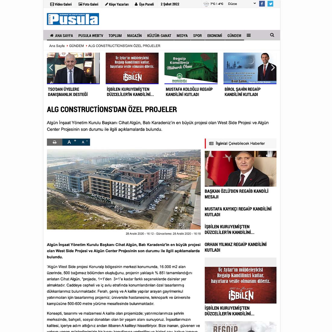 Algün İnşaat Yönetim Kurulu Başkanı Cihat Algün, Batı Karadeniz’in en büyük projesi olan West Side Projesi ve Algün Center Projesinin son durumu ile ilgili açıklamalarda bulundu. Algün İnşaat Yönetim Kurulu Başkanı Cihat Algün, Batı Karadeniz’in en büyük projesi olan West Side Projesi ve Algün Center Projesinin son durumu ile ilgili açıklamalarda bulundu. ‘Algün West Side projesi Konuralp bölgesinin merkezi konumunda, 16.000 m2 alan üzerinde, 500 bağımsız bölümden oluştuğunu, projenin yaklaşık % 85’i tamamlandığını anlatan Cihat Algün, “projede, 1+1’den 3+1’e kadar farklı seçeneklerde daireler yer almaktadır. Caddeye cepheli ve iç avlu etrafında konumlandırılan özel tasarlanmış dükkanlarımız bulunmaktadır. Ferah, geniş ve A kalite yapılar arayan gayrimenkul yatırımcıları için tasarlanmış projemiz; üniversite hastanesine, teknopark ve üniversite kampüsüne 500-600 metre yürüme mesafesinde bulunmaktadır.