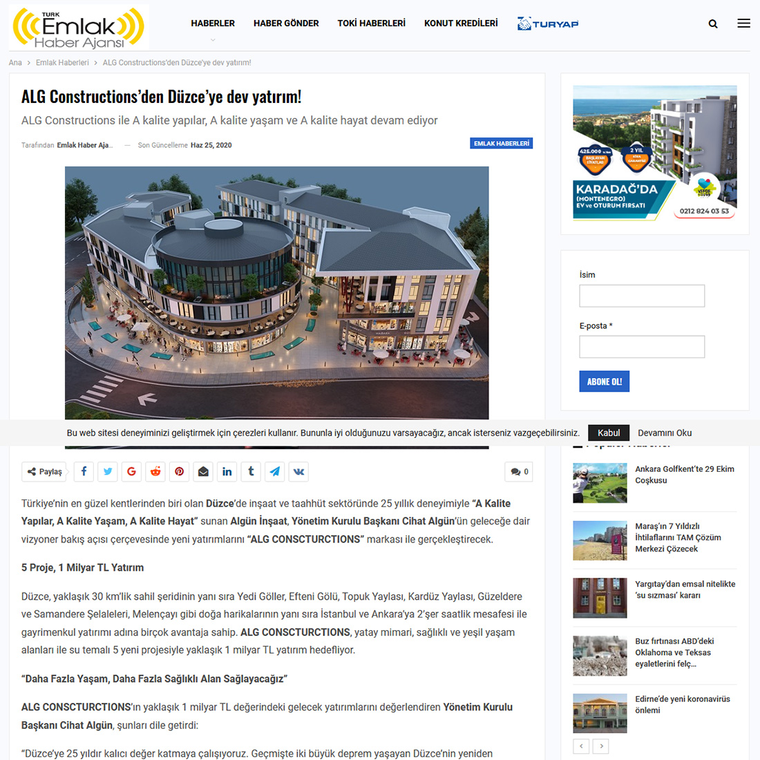 ALG Constructions ile A kalite yapılar, A kalite yaşam ve A kalite hayat devam ediyor Türkiye’nin en güzel kentlerinden biri olan Düzce’de inşaat ve taahhüt sektöründe 25 yıllık deneyimiyle “A Kalite Yapılar, A Kalite Yaşam, A Kalite Hayat” sunan Algün İnşaat, Yönetim Kurulu Başkanı Cihat Algün’ün geleceğe dair vizyoner bakış açısı çerçevesinde yeni yatırımlarını “ALG CONSCTURCTIONS” markası ile gerçekleştirecek. 5 Proje, 1 Milyar TL Yatırım Düzce, yaklaşık 30 km’lik sahil şeridinin yanı sıra Yedi Göller, Efteni Gölü, Topuk Yaylası, Kardüz Yaylası, Güzeldere ve Samandere Şelaleleri, Melençayı gibi doğa harikalarının yanı sıra İstanbul ve Ankara’ya 2’şer saatlik mesafesi ile gayrimenkul yatırımı adına birçok avantaja sahip. ALG CONSCTURCTIONS, yatay mimari, sağlıklı ve yeşil yaşam alanları ile su temalı 5 yeni projesiyle yaklaşık 1 milyar TL yatırım hedefliyor.