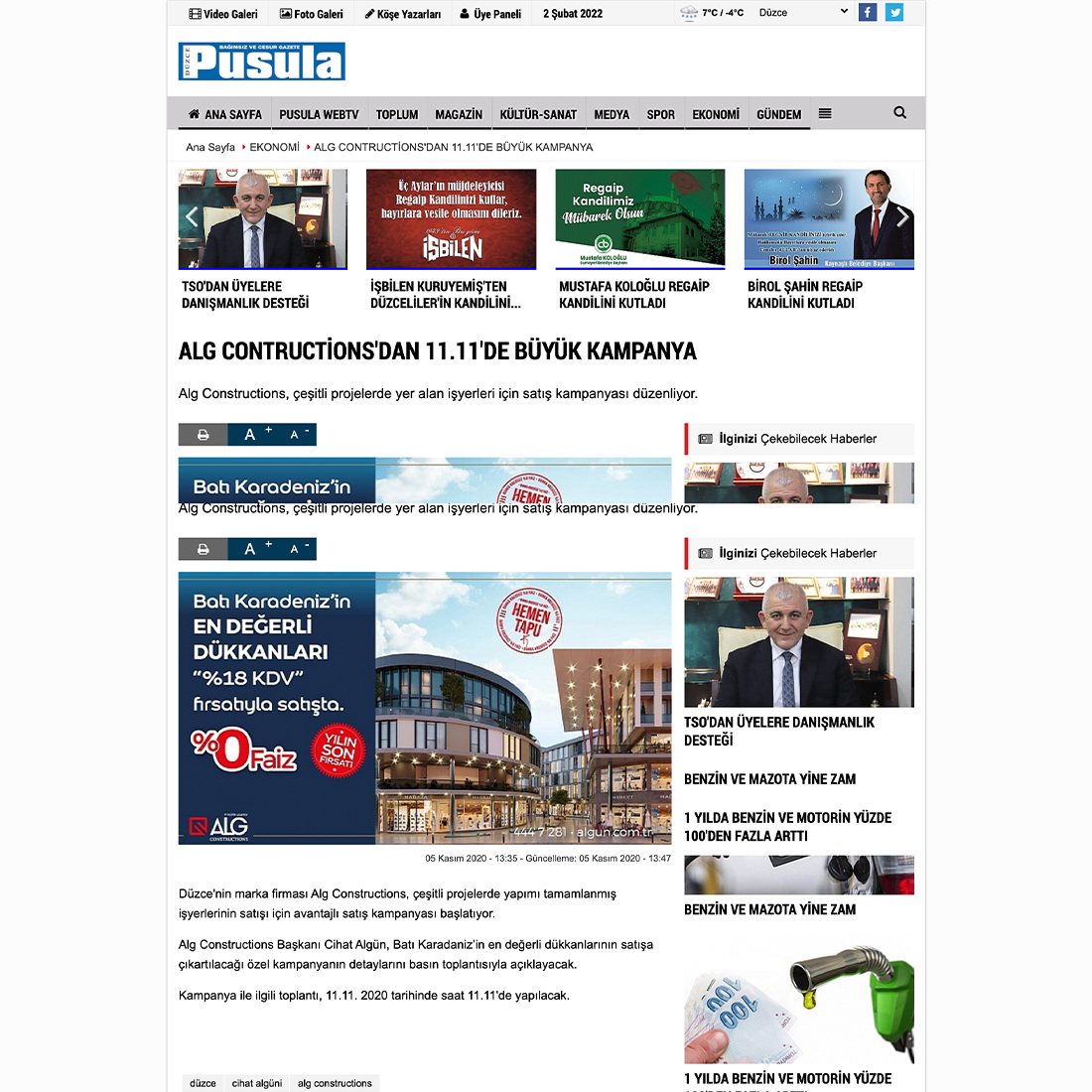 Alg Constructions, çeşitli projelerde yer alan işyerleri için satış kampanyası düzenliyor. Düzce’nin marka firması Alg Constructions, çeşitli projelerde yapımı tamamlanmış işyerlerinin satışı için avantajlı satış kampanyası başlatıyor. Alg Constructions Başkanı Cihat Algün, Batı Karadaniz’in en değerli dükkanlarının satışa çıkartılacağı özel kampanyanın detaylarını basın toplantısıyla açıklayacak. Kampanya ile ilgili toplantı, 11.11. 2020 tarihinde saat 11.11’de yapılacak.