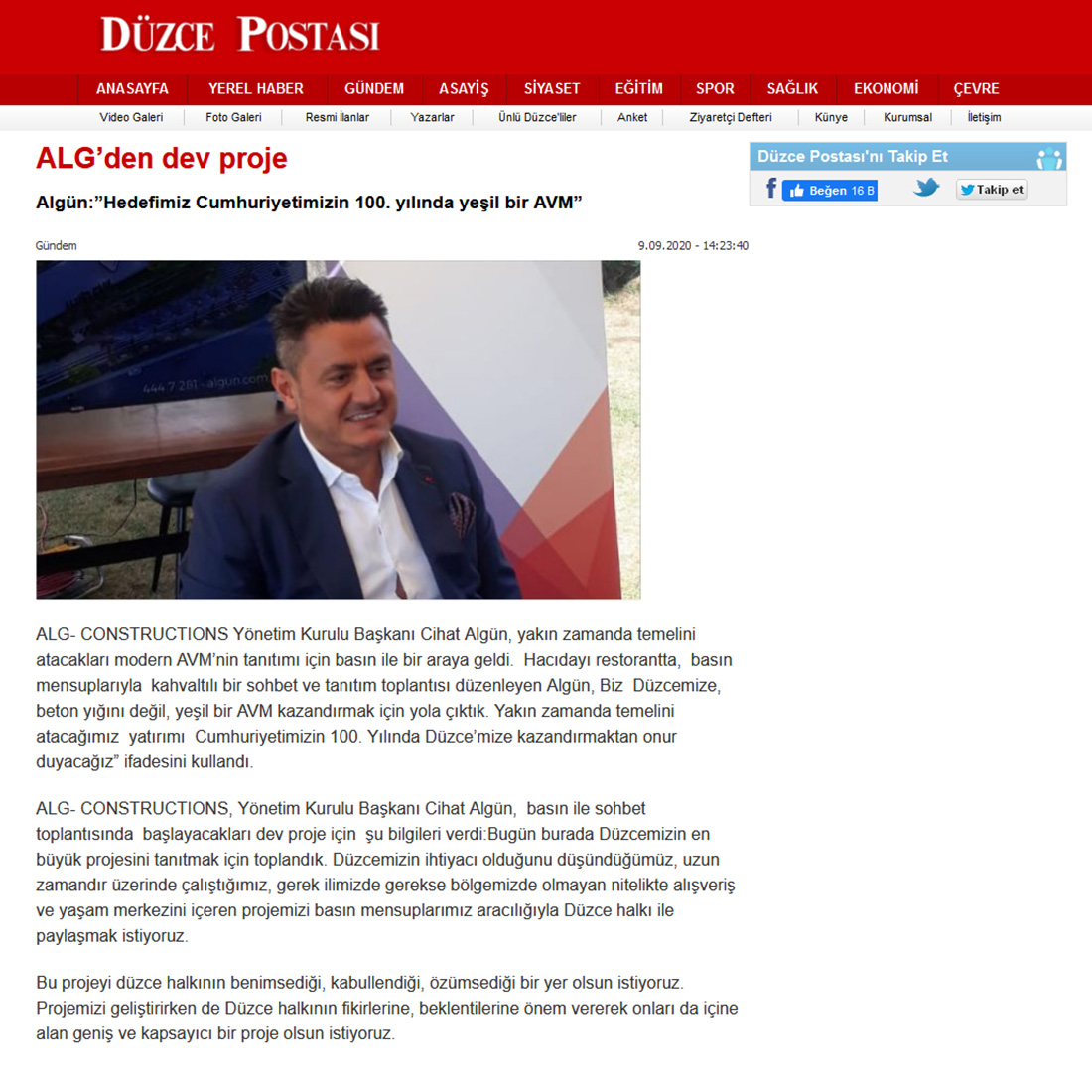 ALG’den dev proje Algün:”Hedefimiz Cumhuriyetimizin 100. yılında yeşil bir AVM” ALG- CONSTRUCTIONS Yönetim Kurulu Başkanı Cihat Algün, yakın zamanda temelini atacakları modern AVM’nin tanıtımı için basın ile bir araya geldi.  Hacıdayı restorantta,  basın mensuplarıyla  kahvaltılı bir sohbet ve tanıtım toplantısı düzenleyen Algün, Biz  Düzcemize, beton yığını değil, yeşil bir AVM kazandırmak için yola çıktık. Yakın zamanda temelini atacağımız  yatırımı  Cumhuriyetimizin 100. Yılında Düzce’mize kazandırmaktan onur duyacağız” ifadesini kullandı.    ALG- CONSTRUCTIONS, Yönetim Kurulu Başkanı Cihat Algün,  basın ile sohbet toplantısında  başlayacakları dev proje için  şu bilgileri verdi.