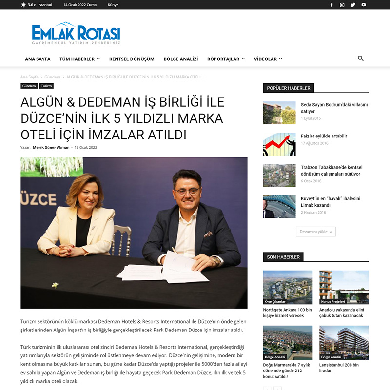 ALGÜN & DEDEMAN İŞ BİRLİĞİ İLE DÜZCE’NİN İLK 5 YILDIZLI MARKA OTELİ İÇİN İMZALAR ATILDI Turizm sektörünün köklü markası Dedeman Hotels & Resorts International ile Düzce’nin önde gelen şirketlerinden Algün İnşaat’ın iş birliğiyle gerçekleştirilecek Park Dedeman Düzce için imzalar atıldı. Türk turizminin ilk uluslararası otel zinciri Dedeman Hotels & Resorts International, gerçekleştirdiği yatırımlarıyla sektörün gelişiminde rol üstlenmeye devam ediyor. Düzce’nin gelişimine, modern bir kent olmasına büyük katkılar sunan, bu güne kadar Düzce’de yaptığı projeler ile 5000’den fazla aileyi ev sahibi yapan Algün ve Dedeman iş birliği ile hayata geçecek Park Dedeman Düzce, ilin ilk ve tek 5 yıldızlı marka oteli olacak. İmza töreni, Dedeman Hotels & Resorts International Yönetim Kurulu Başkanı Banu Dedeman ve Algün İnşaat Yönetim Kurulu Başkanı Cihat Algün ev sahipliğinde 12 Ocak 2022 tarihinde Dedeman İstanbul’da gerçekleştirildi.