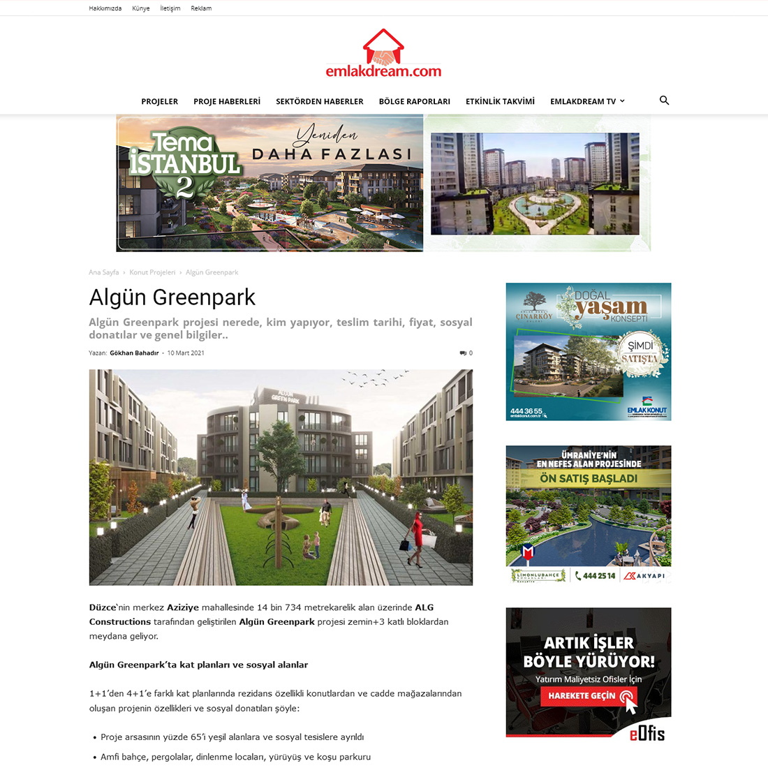 Düzce‘nin merkez Aziziye mahallesinde 14 bin 734 metrekarelik alan üzerinde ALG Constructions tarafından geliştirilen Algün Greenpark projesi zemin+3 katlı bloklardan meydana geliyor. Algün Greenpark’ta kat planları ve sosyal alanlar 1+1’den 4+1’e farklı kat planlarında rezidans özellikli konutlardan ve cadde mağazalarından oluşan projenin özellikleri ve sosyal donatıları şöyle: Proje arsasının yüzde 65’i yeşil alanlara ve sosyal tesislere ayrıldı Amfi bahçe, pergolalar, dinlenme locaları, yürüyüş ve koşu parkuru Çocuklar için oyun alanları Otopark alanları Alışveriş dükkan ve mağazaları 7/24 güvenlik Algün Greenpark’ta satış fiyatları Projede brüt 122 metrekare büyüklüğündeki 3+1 dairelerde satış fiyatları 5 mart 2021 tarihi itibarıyla 390.000 TL seviyelerinde bulunuyor. Fiyatların belirtildiği tarih itibarıyla geçerli olduğunu, ilerleyen zamanlarda fiyat artışlarının olabileceğini göz önünde bulundurmanızı ve ilgili inşaat firmasından yeniden fiyat almanızı tavsiye ederiz.