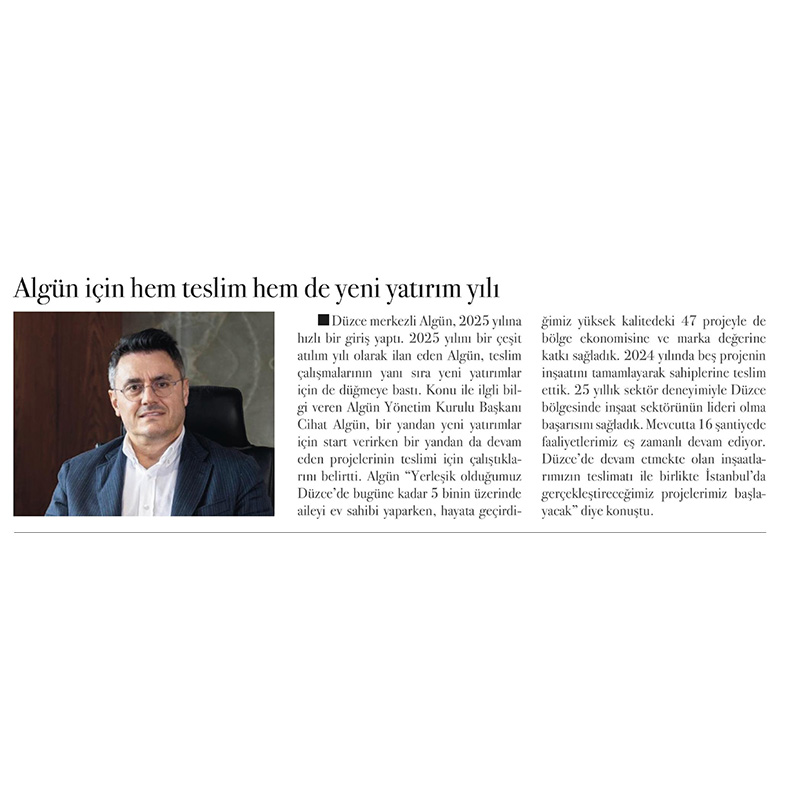 Algün için hem teslim hem de yeni yatırım yılı I Düzce merkezli Algün, 2025 yılma hızlı bir giriş yaptı. 2025 yılını bir çeşit atılım yılı olarak ilan eden Algün, teslim çalışmalarının yanı sıra yeni yatırımlar için de düğmeye bastı. Konu ile ilgli bilgi veren Algün Yönetim Kurulu Başkanı Cihat Algün, bir yandan yeni yatırımlar için start verirken bir yandan da devam eden projelerinin teslimi için çalıştıklarını belirtti.