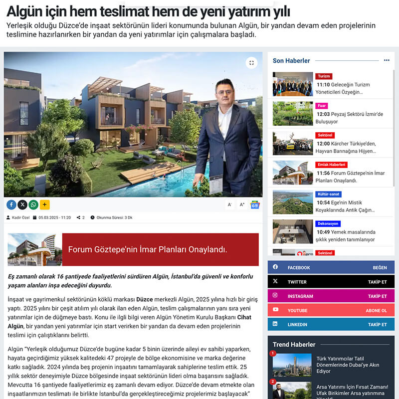 İnşaat ve gayrimenkul sektörünün köklü markası Düzce merkezli Algün, 2025 yılına hızlı bir giriş yaptı. 2025 yılını bir çeşit atılım yılı olarak ilan eden Algün, teslim çalışmalarının yanı sıra yeni yatırımlar için de düğmeye bastı. Konu ile ilgli bilgi veren Algün Yönetim Kurulu Başkanı Cihat Algün, bir yandan yeni yatırımlar için start verirken bir yandan da devam eden projelerinin teslimi için çalıştıklarını belirtti.