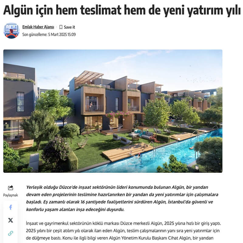 İnşaat ve gayrimenkul sektörünün köklü markası Düzce merkezli Algün, 2025 yılına hızlı bir giriş yaptı. 2025 yılını bir çeşit atılım yılı olarak ilan eden Algün, teslim çalışmalarının yanı sıra yeni yatırımlar için de düğmeye bastı. Konu ile ilgli bilgi veren Algün Yönetim Kurulu Başkanı Cihat Algün, bir yandan yeni yatırımlar için start verirken bir yandan da devam eden projelerinin teslimi için çalıştıklarını belirtti.