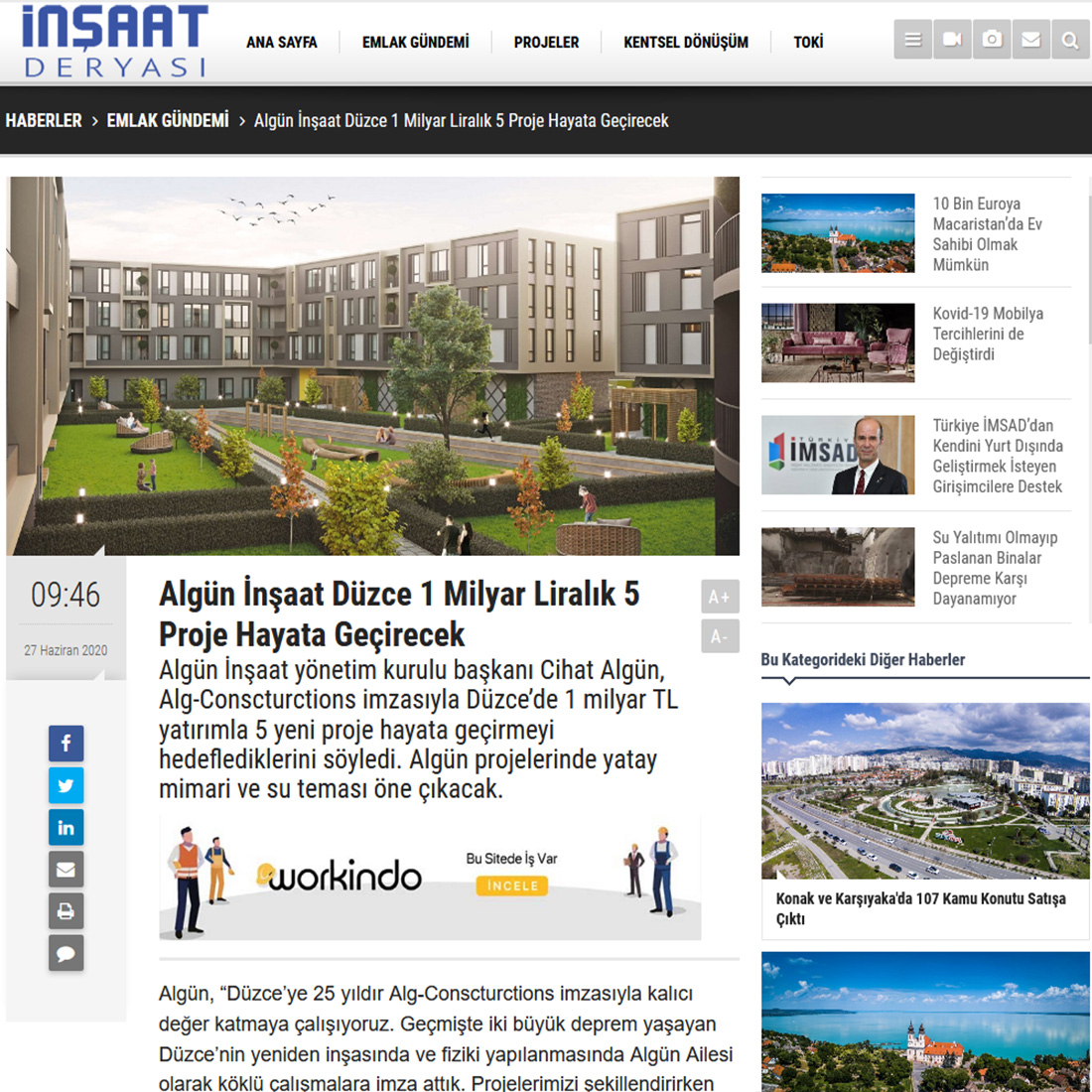 Algün İnşaat Düzce 1 Milyar Liralık 5 Proje Hayata Geçirecek Algün İnşaat yönetim kurulu başkanı Cihat Algün, Alg-Conscturctions imzasıyla Düzce’de 1 milyar TL yatırımla 5 yeni proje hayata geçirmeyi hedeflediklerini söyledi. Algün projelerinde yatay mimari ve su teması öne çıkacak. Algün, “Düzce’ye 25 yıldır Alg-Conscturctions imzasıyla kalıcı değer katmaya çalışıyoruz. Geçmişte iki büyük deprem yaşayan Düzce’nin yeniden inşasında ve fiziki yapılanmasında Algün Ailesi olarak köklü çalışmalara imza attık. Projelerimizi şekillendirirken Düzcelileri refahını, huzurunu ve konforunu temel aldık.