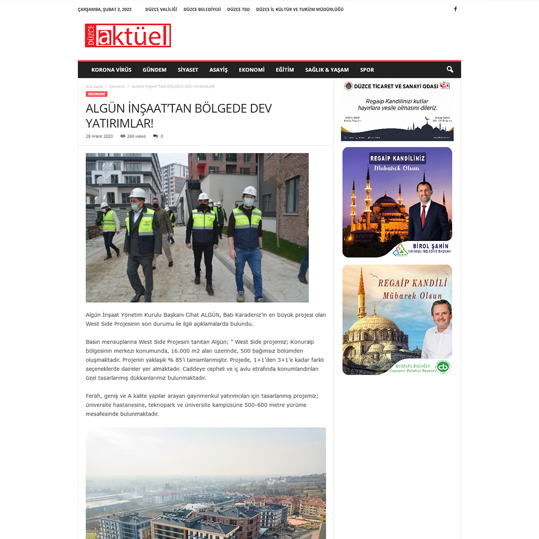 Algün İnşaat Yönetim Kurulu Başkanı Cihat ALGÜN, Batı Karadeniz’in en büyük projesi olan West Side Projesinin son durumu ile ilgili açıklamalarda bulundu.Basın mensuplarına West Side Projesini tanıtan Algün; ” West Side projemiz; Konuralp bölgesinin merkezi konumunda, 16.000 m2 alan üzerinde, 500 bağımsız bölümden oluşmaktadır. Projenin yaklaşık % 85’i tamamlanmıştır. Projede, 1+1’den 3+1’e kadar farklı seçeneklerde daireler yer almaktadır. Caddeye cepheli ve iç avlu etrafında konumlandırılan özel tasarlanmış dükkanlarımız bulunmaktadır.Ferah, geniş ve A kalite yapılar arayan gayrimenkul yatırımcıları için tasarlanmış projemiz; üniversite hastanesine, teknopark ve üniversite kampüsüne 500-600 metre yürüme mesafesinde bulunmaktadır.