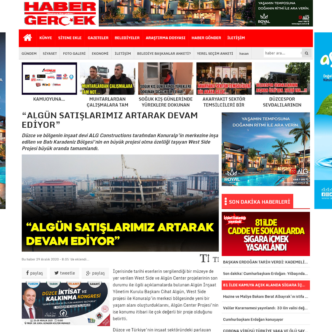 Düzce ve bölgenin inşaat devi ALG Constructions tarafından Konuralp’in merkezine inşa edilen ve Batı Karadeniz Bölgesi’nin en büyük projesi olma özelliği taşıyan West Side Projesi büyük oranda tamamlandı.İçerisinde tarihi eserlerin sergilendiği bir müzeye de yer verilen West Side ve Algün Center projelerinin son durumu ile ilgili açıklamalarda bulunan Algün İnşaat Yönetim Kurulu Başkanı Cihat Algün, West Side projesi ile Konuralp’in merkezi bölgesinde yeni bir yaşam alanı oluşturduklarını, Algün Center Projesi’nin ise konumu itibari ile çok değerli bir proje olduğunu belirtti.