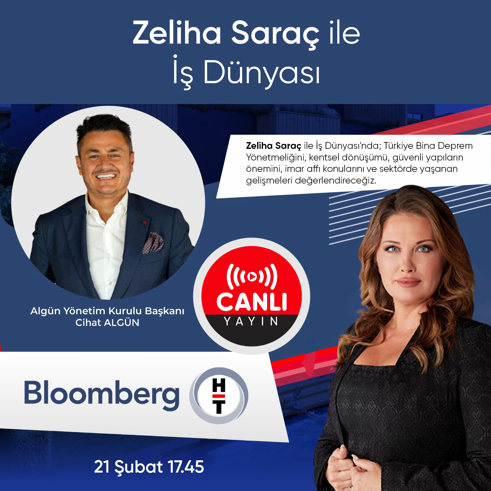 Algün Yönetim Kurulu Başkanımız Cihat Algün, Bloomberg HT’de canlı yayınlanan Zeliha Saraç ile İş Dünyası programına konuk olarak Türkiye bina deprem yönetmeliğini, kentsel dönüşümü, güvenli yapıların önemini, imar affı kanunlarını ve sektörde yaşanan gelişmeleri değerlendirdi.