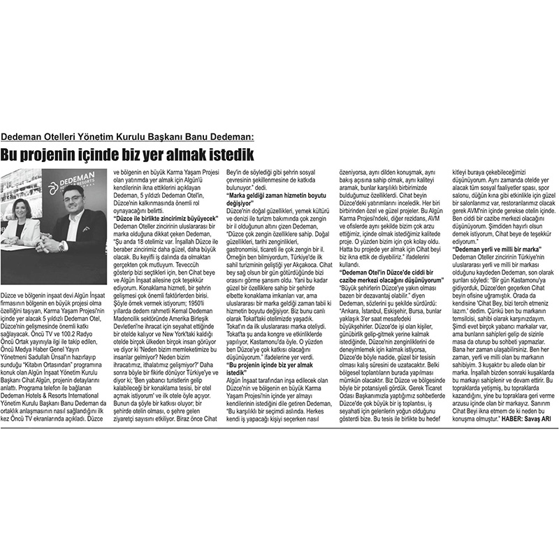 Bu projenin içinde biz yer almak istedik PARK DEMAMAN ve bölgenin inşaat devi Algün İnşaat Yönetim Kurulu Başkanı Cihat Algün’ün konuk  olduğu, Öncü Medya Haber Genel  Yayın Yönetmeni Sadullah Ünlsal’ın hazırlayıp sunduğu “Kitabın Ortasından” programına telefon bağlantısı ile konuk olan Dedeman  Hotels & Resorts International Yönetim Kurulu Başkanı Banu Dedeman bölgenin en büyük projesi olma özelli taşıyan Karma Yaşam Projesi’nin içinde yer almak için Cihat Algün’ü kendilerinin ikna ettiklerini söyledi.