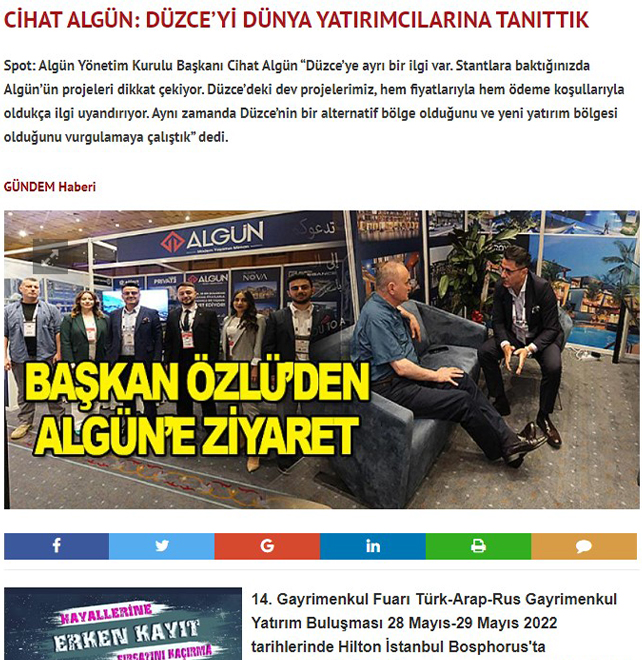Spot: Algün Yönetim Kurulu Başkanı Cihat Algün “Düzce’ye ayrı bir ilgi var. Stantlara baktığınızda Algün’ün projeleri dikkat çekiyor. Düzce’deki dev projelerimiz, hem fiyatlarıyla hem ödeme koşullarıyla oldukça ilgi uyandırıyor. Aynı zamanda Düzce’nin bir alternatif bölge olduğunu ve yeni yatırım bölgesi olduğunu vurgulamaya çalıştık” dedi.