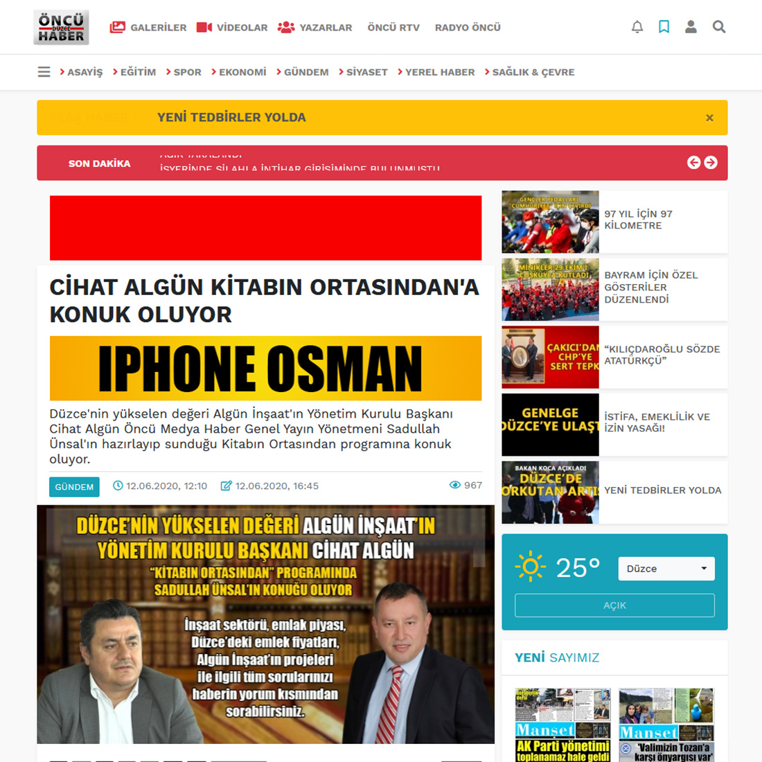 Düzce’nin yükselen değeri Algün İnşaat’ın Yönetim Kurulu Başkanı Cihat Algün Öncü Medya Haber Genel Yayın Yönetmeni Sadullah Ünsal’ın hazırlayıp sunduğu Kitabın Ortasından programına konuk oluyor. Düzce’nin yükselen değeri Algün İnşaat’ın Yönetim Kurulu Başkanı Cihat Algün Öncü Medya Haber Genel Yayın Yönetmeni Sadullah Ünsal’ın hazırlayıp sunduğu Kitabın Ortasından programına konuk oluyor. Düzce’de emlak piyasası, inşaat sektörü, konut fiyatları ve Algün İnşaat’ın projeleri ile ilgili tüm soruları haberin yorum bölümüne yazabilirsiniz. Ünsal merak ettiğiniz tüm soruları, Algün İnşaat Yönetim Kurulu Başkanı Cihat Algün’e Kitabın Ortasından’da soracak. Kitabın Ortasından bu akşam saat 21:00’da Öncü RTV Ortak yayını, Öncü Medya Facebook ve Youtube hesaplarından canlı olarak ekranlara gelecek.