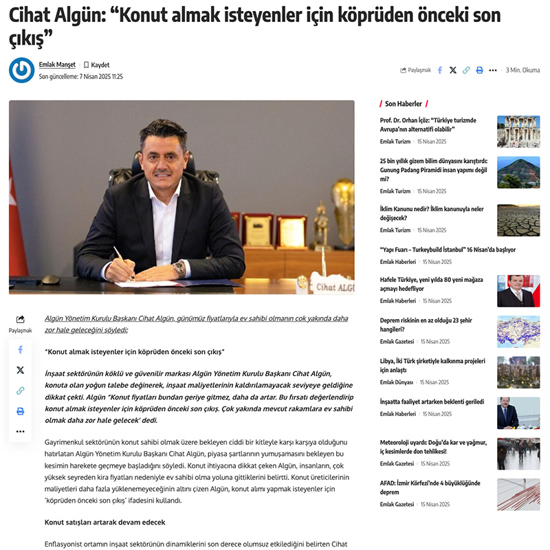 Konut almak isteyenler için köprüden önceki son çıkış. İnşaat sektörünün köklü ve güvenilir markası Algün Yönetim Kurulu Başkanı Cihat Algün, konuta olan yoğun talebe değinerek, inşaat maliyetlerinin kaldırılamayacak seviyeye geldiğine dikkat çekti. Algün “Konut fiyatları bundan geriye gitmez, daha da artar. Bu fırsatı değerlendirip konut almak isteyenler için köprüden önceki son çıkış. Çok yakında mevcut rakamlara ev sahibi olmak daha zor hale gelecek’ dedi.