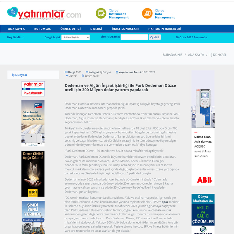 Dedeman ve Algün İnşaat işbirliği ile Park Dedeman Düzce oteli için 300 Milyon dolar yatırım yapılacak Dedeman ve Algün İnşaat işbirliği ile Park Dedeman Düzce oteli için 300 Milyon dolar yatırım yapılacak Dedeman Hotels & Resorts International’ın Algün İnşaat iş birliğiyle hayata geçireceği Park Dedeman Düzce’nin imza töreni gerçekleştirildi. Törende konuşan Dedeman Hotels & Resorts International Yönetim Kurulu Başkanı Banu Dedeman, Algün İnşaat ve Dedeman iş birliğiyle Düzce’nin ilk ve tek markalı otelini hayata geçireceklerini belirtti. Türkiye’nin ilk uluslararası otel zinciri olarak halihazırda 18 otel, 2 bin 800 oda, 5 bin 700 yatak kapasitesi ve 1.000’i aşkın çalışanla, bulundukları bölgelerde turizmin gelişmesine destek olduklarını ifade eden Dedeman, “Sahip olduğumuz tecrübe ve bilgi birikimi, yetişmiş ve başarılı kadromuz, sürdürülebilir stratejimiz ile tüm dünyayı etkileyen salgın döneminde de yatırımlarımıza ara vermeden devam ettik.” diye konuştu.