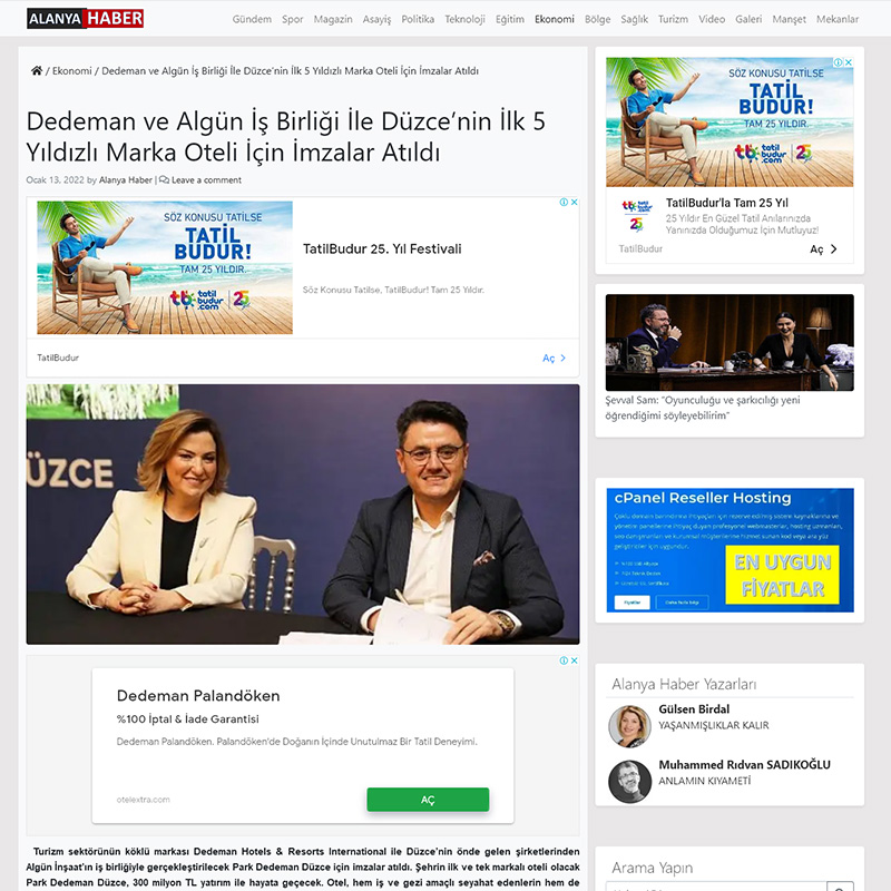 Dedeman ve Algün İş Birliği İle Düzce’nin İlk 5 Yıldızlı Marka Oteli İçin İmzalar Atıldı Turizm sektörünün köklü markası Dedeman Hotels & Resorts International ile Düzce’nin önde gelen şirketlerinden Algün İnşaat’ın iş birliğiyle gerçekleştirilecek Park Dedeman Düzce için imzalar atıldı. Şehrin ilk ve tek markalı oteli olacak Park Dedeman Düzce, 300 milyon TL yatırım ile hayata geçecek. Otel, hem iş ve gezi amaçlı seyahat edenlerin hem de bölgenin ihtiyaçlarını karşılayacak. Türk turizminin ilk uluslararası otel zinciri Dedeman Hotels & Resorts International, gerçekleştirdiği yatırımlarıyla sektörün gelişiminde rol üstlenmeye devam ediyor. Düzce’nin gelişimine, modern bir kent olmasına büyük katkılar sunan, bu güne kadar Düzce’de yaptığı projeler ile 5000’den fazla aileyi ev sahibi yapan Algün ve Dedeman iş birliği ile hayata geçecek Park Dedeman Düzce, ilin ilk ve tek 5 yıldızlı marka oteli olacak.
