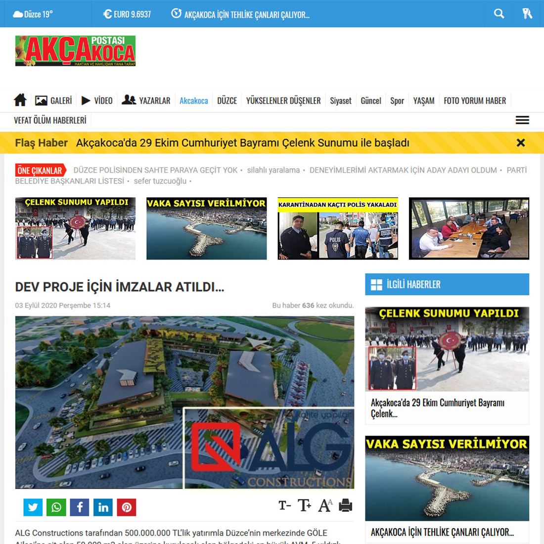 DEV PROJE İÇİN İMZALAR ATILDI… ALG Constructions tarafından 500.000.000 TL’lik yatırımla Düzce’nin merkezinde GÖLE Ailesi’ne ait olan 50.000 m2 alan üzerine kurulacak olan bölgedeki en büyük AVM, 5 yıldızlı otel, ofis ve rezidanslardan oluşan mega projenin imzaları Cihat ALGÜN ve Göle ailesi tarafından atıldı. Bölgesinin en kapsamlı Karma Yaşam Projesinin yapılacağını ifade eden Cihat ALGÜN; Düzce’mize değer katacak olan projemiz için imzalarımızı attık. Uluslararası standartlarda ve kalitede yapacağımız mega projemiz için çalışmalara başlandığını ifade eden Cihat ALGÜN ” bölgenin alışveriş, yeme içme, turizm ve iş hayatının tüm ihtiyaçlarını karşılayacak olan karma yaşam projemiz Düzce’nin değerine değer katacağını” ifade etti.