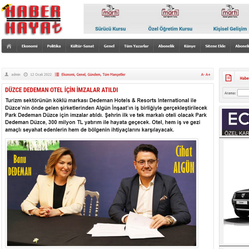 Turizm sektörünün köklü markası Dedeman Hotels & Resorts International ile Düzce’nin önde gelen şirketlerinden Algün İnşaat’ın iş birliğiyle gerçekleştirilecek Park Dedeman Düzce için imzalar atıldı. Şehrin ilk ve tek markalı oteli olacak Park Dedeman Düzce, 300 milyon TL yatırım ile hayata geçecek. Otel, hem iş ve gezi amaçlı seyahat edenlerin hem de bölgenin ihtiyaçlarını karşılayacak.Türk turizminin ilk uluslararası otel zinciri Dedeman Hotels & Resorts International, gerçekleştirdiği yatırımlarıyla sektörün gelişiminde rol üstlenmeye devam ediyor. Düzce’nin gelişimine, modern bir kent olmasına büyük katkılar sunan, bu güne kadar Düzce’de yaptığı projeler ile 5000’den fazla aileyi ev sahibi yapan Algün ve Dedeman iş birliği ile hayata geçecek Park Dedeman Düzce, ilin ilk ve tek 5 yıldızlı marka oteli olacak.İmza töreni, Dedeman Hotels & Resorts International Yönetim Kurulu Başkanı Banu Dedeman ve Algün İnşaat Yönetim Kurulu Başkanı Cihat Algün ev sahipliğinde Dedeman İstanbul’da gerçekleştirildi. Törene, Düzce Belediye Başkanı Dr. Faruk Özlü ile Düzce Ticaret ve Sanayi Odası Yönetim Kurulu Başkanı Tuncay Şahin de katıldı.