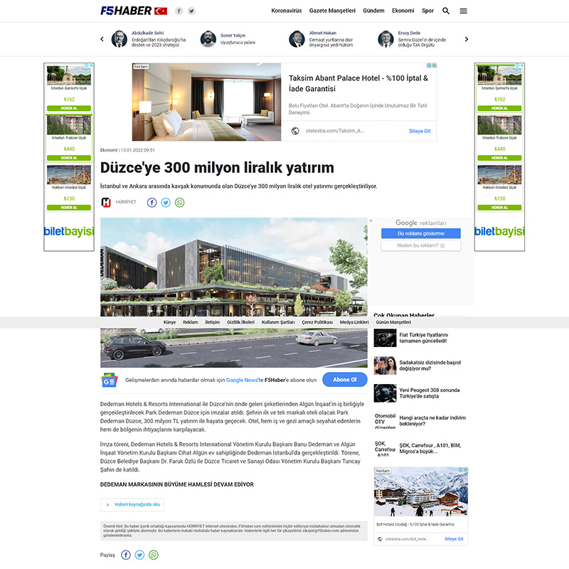 Düzce’ye 300 milyon liralık yatırım İstanbul ve Ankara arasında kavşak konumunda olan Düzce’ye 300 milyon liralık otel yatırımı gerçekleştiriliyor. Dedeman Hotels & Resorts International ile Düzce’nin önde gelen şirketlerinden Algün İnşaat’ın iş birliğiyle gerçekleştirilecek Park Dedeman Düzce için imzalar atıldı. Şehrin ilk ve tek markalı oteli olacak Park Dedeman Düzce, 300 milyon TL yatırım ile hayata geçecek. Otel, hem iş ve gezi amaçlı seyahat edenlerin hem de bölgenin ihtiyaçlarını karşılayacak.İmza töreni, Dedeman Hotels & Resorts International Yönetim Kurulu Başkanı Banu Dedeman ve Algün İnşaat Yönetim Kurulu Başkanı Cihat Algün ev sahipliğinde Dedeman İstanbul’da gerçekleştirildi.