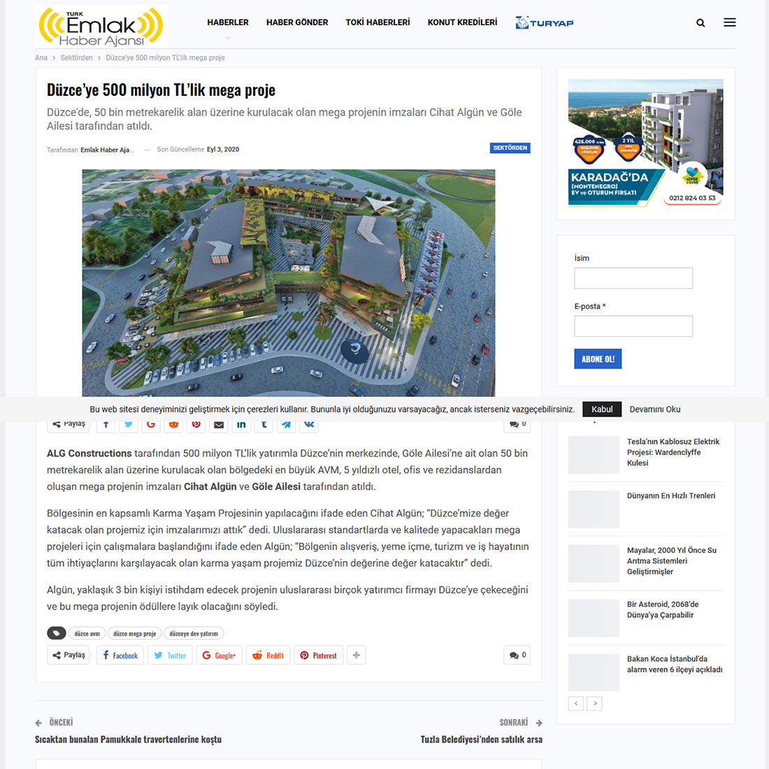 Düzce’de mega proje için imzalar atıldı! ALG Constructions tarafından 500 milyon TL’lik yatırımla Düzce’nin merkezinde GÖLE Ailesi’ne ait olan 50 bin metrekare alan üzerine kurulacak olan bölgedeki en büyük AVM, 5 yıldızlı otel, ofis ve rezidanslardan oluşan mega projenin imzaları Cihat ALGÜN ve Göle ailesi tarafından atıldı. Bölgesinin en kapsamlı Karma Yaşam Projesinin yapılacağını ifade eden Cihat ALGÜN; Düzce’mize değer katacak olan projemiz için imzalarımızı attık dedi. Uluslararası standartlarda ve kalitede yapacağımız mega projemiz için çalışmalara başlandığını ifade eden Cihat ALGÜN bölgenin alışveriş, yeme içme, turizm ve iş hayatının tüm ihtiyaçlarını karşılayacak olan karma yaşam projemiz Düzce’nin değerine değer katacaktır dedi.