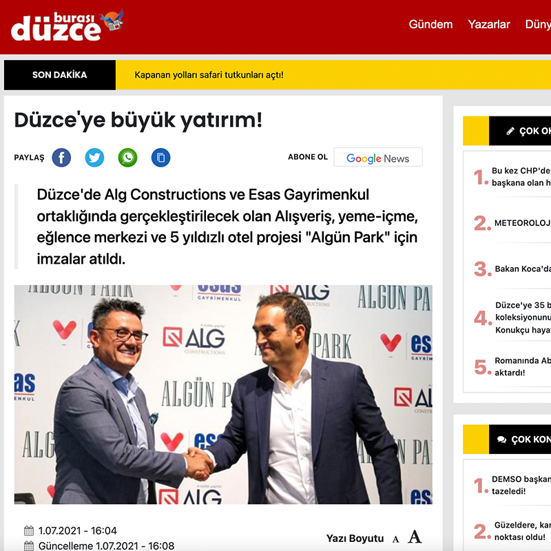 Karadeniz’in en büyük karma yaşam projesinde imzalar atıldı Düzce’de Alg Constructions ve Esas Gayrimenkul ortaklığında gerçekleştirilecek olan Karadeniz’in en büyük yaşam projesi, 750 milyon TL’lik yatırımla hayata geçirilecek. Düzce’de yükselecek olan Karadeniz’in en büyük karma yaşam projesi Algün Park’ta, Alg Constructions ve sektörün önemli temsilcilerinden Esas Gayrimenkul iş ortaklığı başlıyor. ALG Constructions Başkanı Cihat Algün ve Esas Gayrimenkul Yönetim Kurulu Başkanı Kazım Köseoğlu, Esas Gayrimenkul CEO Cem Eriç, Esas Gayrimenkul Varlık Yönetimi Lideri Nevzat Yavan, sektörde heyecan oluşturan büyük iş birliğinin detaylarını açıklamak üzere basın toplantısında bir araya geldi.