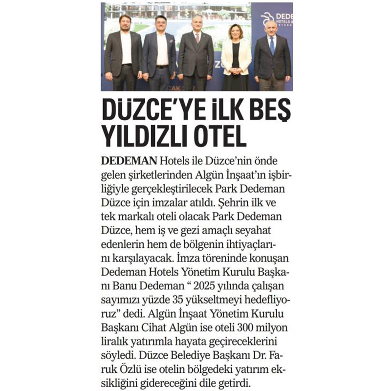 DUZCEYE İLK BES YILDIZLI OTEL DEDEMAN Hotels ile Düzce’nin önde gelen şirketlerinden Algün İnşaat’ın işbirliğiyle gerçekleştirilecek Park Dedeman Düzce için imzalar atıldı. Şehrin ilk ve tek markalı oteli olacak Park Dedeman Düzce, hem iş ve gezi amaçlı seyahat edenlerin hem de bölgenin ihtiyaçlarını karşılayacak. İmza töreninde konuşan Dedeman Hotels Yönetim Kurulu Başkanı Banu Dedeman” 2025 yılında çalışan sayımızı yüzde 35 yükseltmeyi hedefliyoruz” dedi. Algün İnşaat Yönetim Kurulu Başkanı Cihat Algün ise oteli 300 milyon liralık yatırımla hayata geçireceklerini söyledi. Düzce Belediye Başkanı Dr. Faruk Özlü ise otelin bölgedeki yatırım eksikliğini gidereceğini dile getirdi