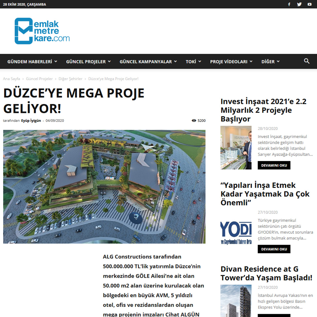 ALG Constructions tarafından 500.000.000 TL’lik yatırımla Düzce’nin merkezinde GÖLE Ailesi’ne ait olan 50.000 m2 alan üzerine kurulacak olan bölgedeki en büyük AVM, 5 yıldızlı otel, ofis ve rezidanslardan oluşan mega projenin imzaları Cihat ALGÜN ve Göle ailesi tarafından atıldı. Bölgesinin en kapsamlı Karma Yaşam Projesinin yapılacağını ifade eden Cihat Algün “Düzce’mize değer katacak olan projemiz için imzalarımızı attık” dedi. Uluslararası standartlarda ve kalitede yapacağımız mega projemiz için çalışmalara başlandığını ifade eden Cihat Algün “ Bölgenin alışveriş, yeme içme, turizm ve iş hayatının tüm ihtiyaçlarını karşılayacak olan karma yaşam projemiz Düzce’nin değerine değer katacaktır dedi. Algün ayrıca , yarım milyar TL’lik yatırımla 3 bin kişiye istihdam sağlayacak ve uluslararası birçok yatırımcı firmayı Düzce’ye çekecek olan mega projenin ödüllere layık olacağını söyledi.