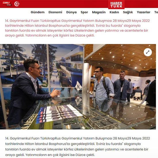 14. Gayrimenkul Fuarı TürkArapRus Gayrimenkul Yatırım Buluşması 28 Mayıs29 Mayıs 2022 tarihlerinde Hilton İstanbul Bosphorus’ta gerçekleştirildi. ‘Eviniz bu fuarda” sloganıyla tanıtılan fuarda ev almak isteyenler körfez ülkelerinden gelen yatırımcı ve acentelerle bir araya geldi. Yatırımcıların en çok ilgisini ise Düzce çekti.