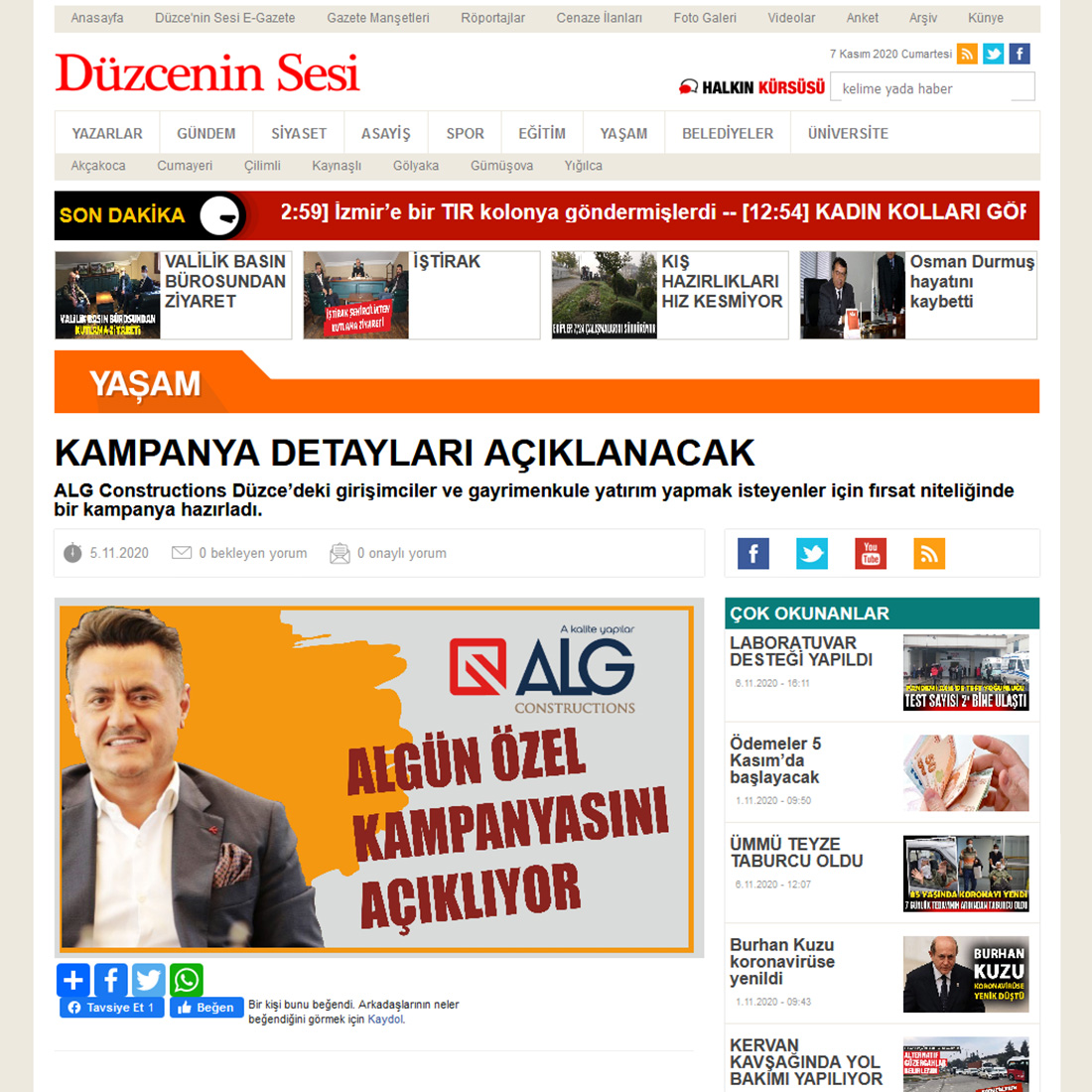 Son dönemde inşaat sektöründe yeni vizyonuyla dikkat çeken Alg Constructions Yönetim Kurulu Başkanı Cihat Algün, Batı Karadeniz Bölgesi’nin en değerli dükkanlarını satışa çıkaracak. Algün detayları 11 Kasım Çarşamba Günü düzenleyeceği basın toplantısıyla açıklayacak. Basın toplantısı Çoban mevkiinde bulunan ALG Plaza’da düzenlenecek. Algün tüm ayrıntıları kamuoyu ile paylaşarak dükkanların satışlarıyla ilgili olarak bilgiler verecek. 11 Kasım Çarşamba günü ALG Plaza’da düzenlenecek toplantı, saat 10:30’da kahvaltı, saat 11:11’de ise kampanya tanıtımı ile devam edecek.