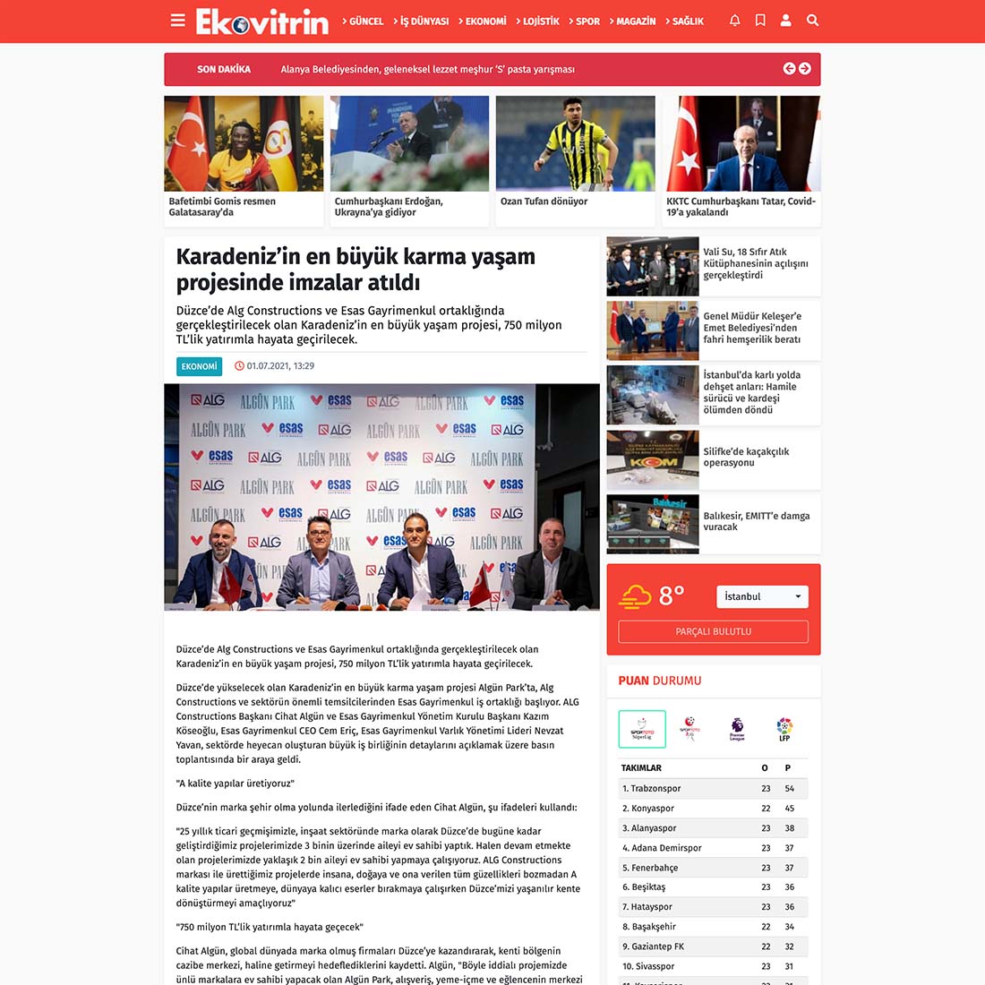 Karadeniz’in en büyük karma yaşam projesinde imzalar atıldı Düzce’de Alg Constructions ve Esas Gayrimenkul ortaklığında gerçekleştirilecek olan Karadeniz’in en büyük yaşam projesi, 750 milyon TL’lik yatırımla hayata geçirilecek. Düzce’de yükselecek olan Karadeniz’in en büyük karma yaşam projesi Algün Park’ta, Alg Constructions ve sektörün önemli temsilcilerinden Esas Gayrimenkul iş ortaklığı başlıyor. ALG Constructions Başkanı Cihat Algün ve Esas Gayrimenkul Yönetim Kurulu Başkanı Kazım Köseoğlu, Esas Gayrimenkul CEO Cem Eriç, Esas Gayrimenkul Varlık Yönetimi Lideri Nevzat Yavan, sektörde heyecan oluşturan büyük iş birliğinin detaylarını açıklamak üzere basın toplantısında bir araya geldi.