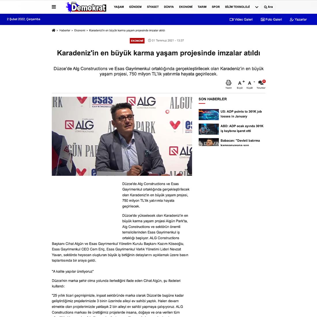 Karadeniz’in en büyük karma yaşam projesinde imzalar atıldı Düzce’de Alg Constructions ve Esas Gayrimenkul ortaklığında gerçekleştirilecek olan Karadeniz’in en büyük yaşam projesi, 750 milyon TL’lik yatırımla hayata geçirilecek. Düzce’de yükselecek olan Karadeniz’in en büyük karma yaşam projesi Algün Park’ta, Alg Constructions ve sektörün önemli temsilcilerinden Esas Gayrimenkul iş ortaklığı başlıyor. ALG Constructions Başkanı Cihat Algün ve Esas Gayrimenkul Yönetim Kurulu Başkanı Kazım Köseoğlu, Esas Gayrimenkul CEO Cem Eriç, Esas Gayrimenkul Varlık Yönetimi Lideri Nevzat Yavan, sektörde heyecan oluşturan büyük iş birliğinin detaylarını açıklamak üzere basın toplantısında bir araya geldi.