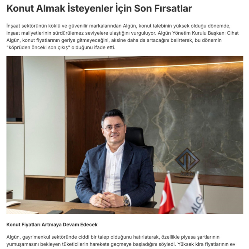 İnşaat sektörünün köklü ve güvenilir markalarından Algün, konut talebinin yüksek olduğu dönemde, inşaat maliyetlerinin sürdürülemez seviyelere ulaştığını vurguluyor. Algün Yönetim Kurulu Başkanı Cihat Algün, konut fiyatlarının geriye gitmeyeceğini, aksine daha da artacağını belirterek, bu dönemin “köprüden önceki son çıkış” olduğunu ifade etti.