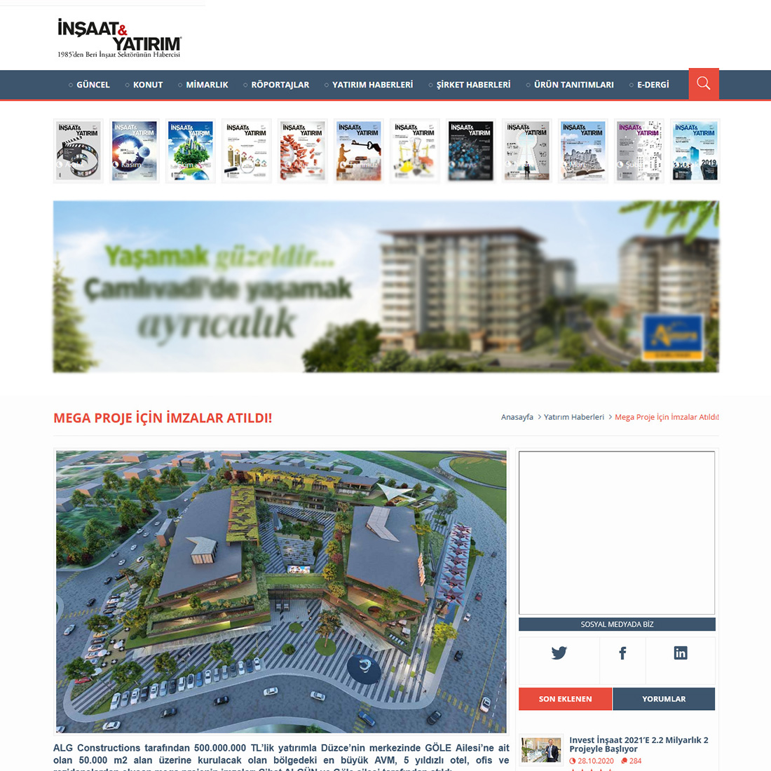 Düzce’de mega proje için imzalar atıldı! ALG Constructions tarafından 500 milyon TL’lik yatırımla Düzce’nin merkezinde GÖLE Ailesi’ne ait olan 50 bin metrekare alan üzerine kurulacak olan bölgedeki en büyük AVM, 5 yıldızlı otel, ofis ve rezidanslardan oluşan mega projenin imzaları Cihat ALGÜN ve Göle ailesi tarafından atıldı. Bölgesinin en kapsamlı Karma Yaşam Projesinin yapılacağını ifade eden Cihat ALGÜN; Düzce’mize değer katacak olan projemiz için imzalarımızı attık dedi. Uluslararası standartlarda ve kalitede yapacağımız mega projemiz için çalışmalara başlandığını ifade eden Cihat ALGÜN bölgenin alışveriş, yeme içme, turizm ve iş hayatının tüm ihtiyaçlarını karşılayacak olan karma yaşam projemiz Düzce’nin değerine değer katacaktır dedi.