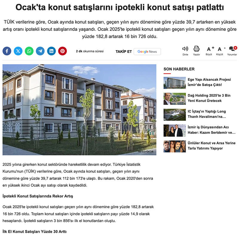 TÜİK verilerine göre, Ocak ayında konut satışları, geçen yılın aynı dönemine göre yüzde 39,7 artarken en yüksek artış oranı ipotekli konut satışlarında yaşandı. Ocak 2025’te ipotekli konut satışları geçen yılın aynı dönemine göre yüzde 182,8 artarak 16 bin 726 oldu.