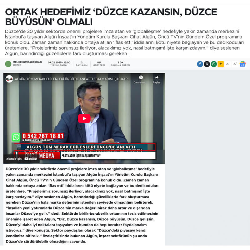 Düzce’de 30 yıldır sektörde önemli projelere imza atan ve ‘globalleşme’ hedefiyle yakın zamanda merkezini İstanbul’a taşıyan Algün İnşaat’ın Yönetim Kurulu Başkanı Cihat Algün, Öncü TV’nin Gündem Özel programına konuk oldu. Zaman zaman hakkında ortaya atılan ‘İflas etti’ iddialarını kötü niyete bağlayan ve bu dedikoduları üretenlere, “Projelerimiz sorunsuz ilerliyor, alacaklımız yok, nasıl batmışım! İşte karşınızdayım.” diye seslenen Algün, barındırdığı güzelliklerle fark oluşturması gereken Düzce’nin hala marka değerinin istenilen seviyede olmadığını belirterek, “İnşallah yeni yatırımlarla Düzce’nin marka değeri biraz daha artar ve dışarıdan insanlar Düzce’ye gelir.”