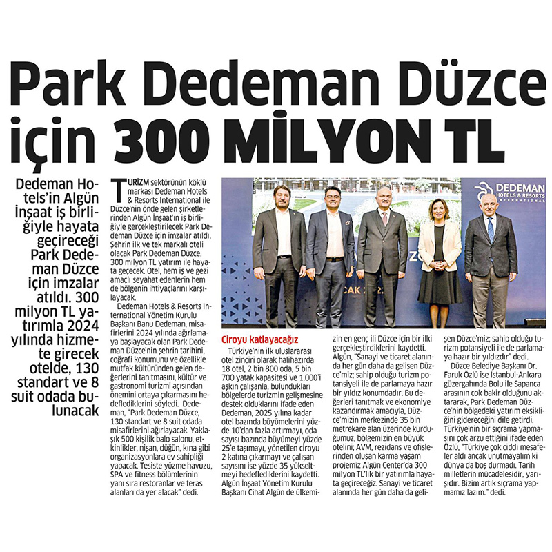 Park Dedeman Düzce için 300 MİLYON TL Dedeman Hotels’in Algün İnşaat iş birliğiyle hayata geçireceği Park Dedeman Düzce için imzalar atıldı. 300 milyon TL yatırımla 2024 yılında hizmete girecek otelde, 130 standart ve 8 süit odada bulunacak TURİZM sektörünün köklü markası Dedeman Hotels & Resorts International ile Düzce’nin önde gelen şirketlerinden Algün İnşaatın iş birliğiyle gerçekleştirilecek Park Dedeman Düzce için imzalar atıldı. Şehrin ilk ve tek markalı oteli olacak Park Dedeman Düzce, 300 milyon TL yatırım ile hayata geçecek. Otel, hem iş ve gezi amaçlı seyahat edenlerin hem de bölgenin ihtiyaçlarını karşılayacak.