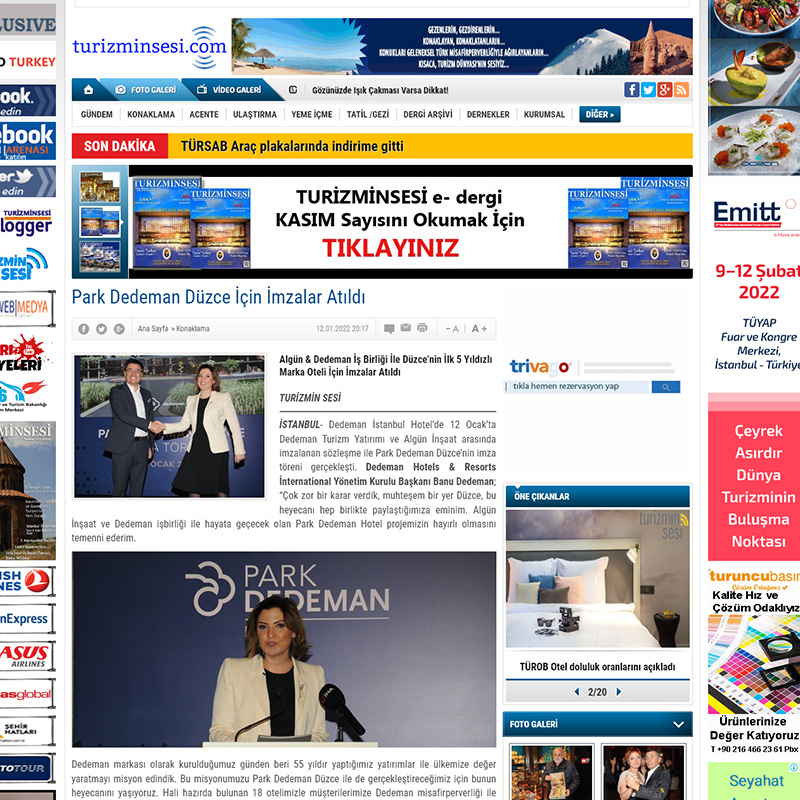 Park Dedeman Düzce İçin İmzalar Atıldı Algün & Dedeman İş Birliği İle Düzce’nin İlk 5 Yıldızlı Marka Oteli İçin İmzalar Atıldı – Dedeman İstanbul Hotel’de 12 Ocak’ta Dedeman Turizm Yatırımı ve Algün İnşaat arasında imzalanan sözleşme ile Park Dedeman Düzce’nin imza töreni gerçekleşti. ; “Çok zor bir karar verdik, muhteşem bir yer Düzce, bu heyecanı hep birlikte paylaştığımıza eminim. Algün İnşaat ve Dedeman işbirliği ile hayata geçecek olan Park Dedeman Hotel projemizin hayırlı olmasını temenni ederim. Dedeman markası olarak kurulduğumuz günden beri 55 yıldır yaptığımız yatırımlar ile ülkemize değer yaratmayı misyon edindik.Bu misyonumuzu Park Dedeman Düzce ile de gerçekleştireceğimiz için bunun heyecanını yaşıyoruz.