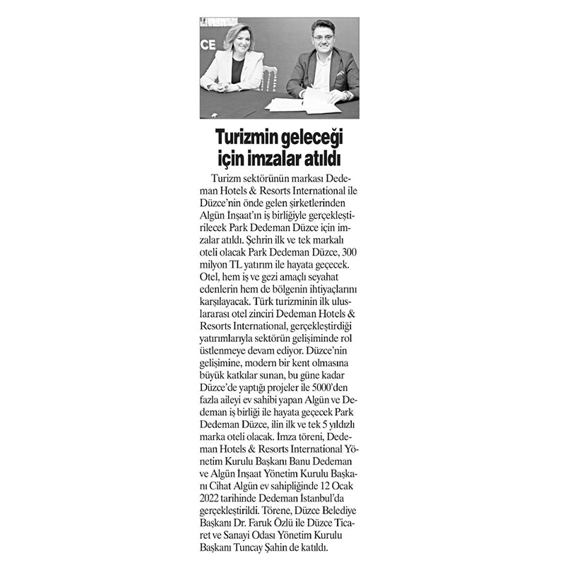 Turizmin geleceği için imzalar atıldı Turizm sektörünün markası Dedeman Hotels & Resorts International ile Düzce’nin önde gelen şirketlerinden Algün İnşaat’ın iş birliğiyle gerçekleştirilecek Park Dedeman Düzce için imzalar atıldı. Şehrin ilk ve tek markalı oteli olacak Park Dedeman Düzce, 300 milyon TL yatırım ile hayata geçecek. Otel, hem iş ve gezi amaçlı seyahat edenlerin hem de bölgenin ihtiyaçlarını karşılayacak. Türk turizminin ilk uluslararası otel zinciri Dedeman Hotels & Resorts International, gerçekleştirdiği yatırımlarıyla sektörün gelişiminde rol üstlenmeye devam ediyor. Düzce’nin gelişimine, modern bir kent olmasına büyük katkılar sunan, bu güne kadar Düzce’de yaptığı projeler ile 5000’den fazla aileyi ev sahibi yapan Algün ve Dedeman iş birliği ile hayata geçecek Park Dedeman Düzce, ilin ilk ve tek 5 yıldızlı marka oteli olacak.