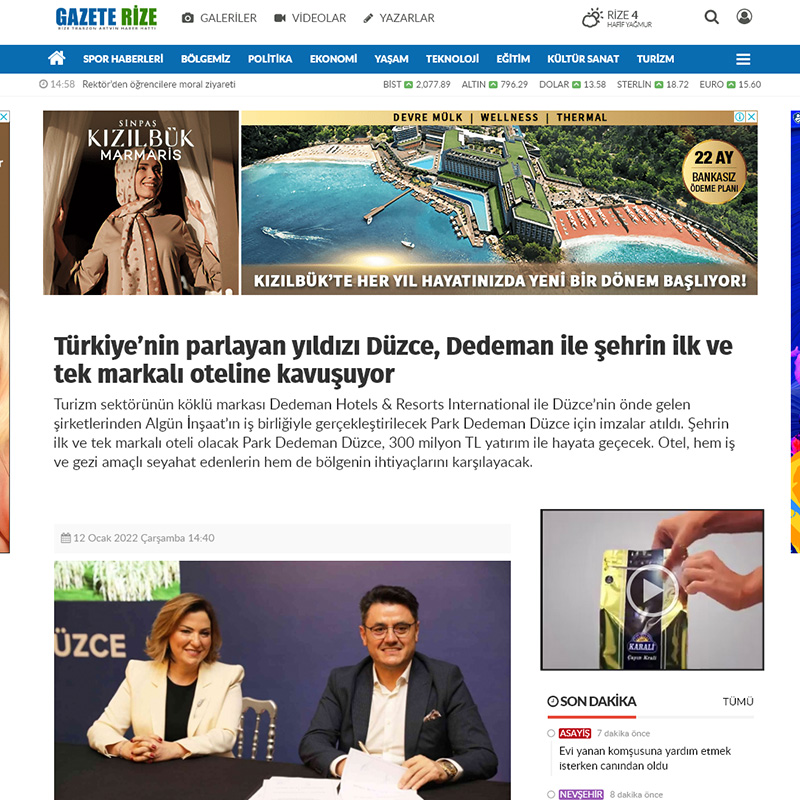 Turizm sektörünün köklü markası Dedeman Hotels & Resorts International ile Düzce’nin önde gelen şirketlerinden Algün İnşaat’ın iş birliğiyle gerçekleştirilecek Park Dedeman Düzce için imzalar atıldı. Şehrin ilk ve tek markalı oteli olacak Park Dedeman Düzce, 300 milyon TL yatırım ile hayata geçecek. Otel, hem iş ve gezi amaçlı seyahat edenlerin hem de bölgenin ihtiyaçlarını karşılayacak. Turizm sektörünün köklü markası Dedeman Hotels & Resorts International ile Düzce’nin önde gelen şirketlerinden Algün İnşaat’ın iş birliğiyle gerçekleştirilecek Park Dedeman Düzce için imzalar atıldı. Şehrin ilk ve tek markalı oteli olacak Park Dedeman Düzce, 300 milyon TL yatırım ile hayata geçecek. Otel, hem iş ve gezi amaçlı seyahat edenlerin hem de bölgenin ihtiyaçlarını karşılayacak. Türk turizminin ilk uluslararası otel zinciri Dedeman Hotels & Resorts International, gerçekleştirdiği yatırımlarıyla sektörün gelişiminde rol üstlenmeye devam ediyor. Düzce’nin gelişimine, modern bir kent olmasına büyük katkılar sunan, bu güne kadar Düzce’de yaptığı projeler ile 5000’den fazla aileyi ev sahibi yapan Algün ve Dedeman iş birliği ile hayata geçecek Park Dedeman Düzce, ilin ilk ve tek 5 yıldızlı marka oteli olacak.