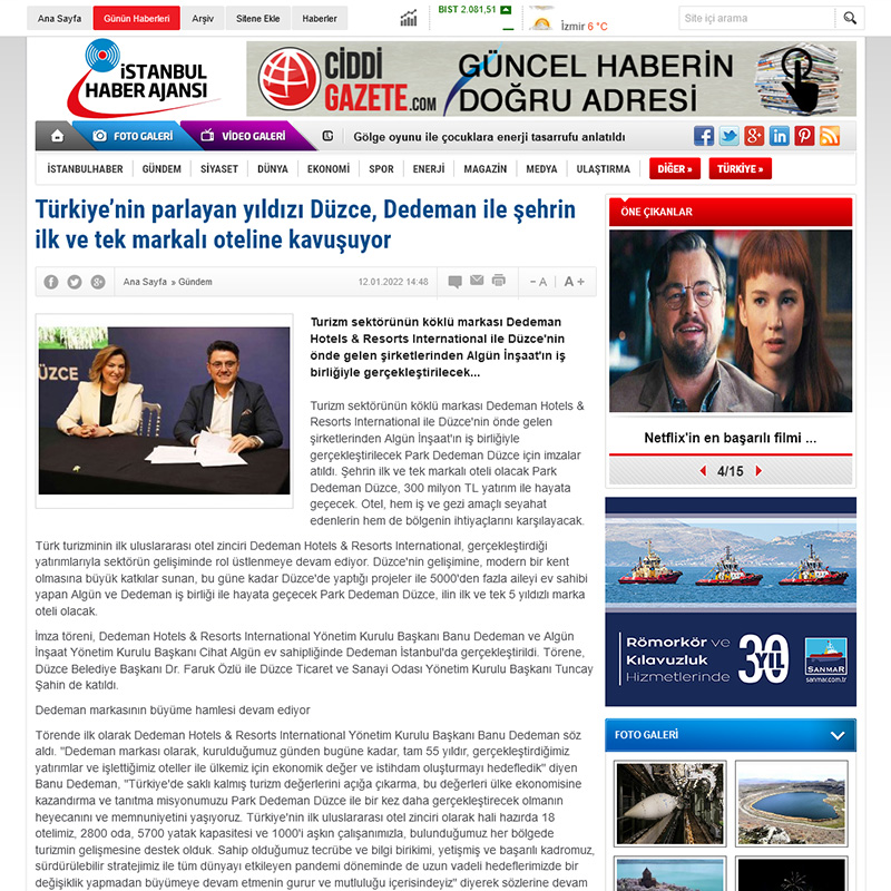 Turizm sektörünün köklü markasi Dedeman Hotels & Resorts International ile Düzce’nin önde gelen sirketlerinden Algün Insaat’in is birligiyle gerçeklestirilecek Park Dedeman Düzce için imzalar atildi. Sehrin ilk ve tek markali oteli olacak Park Dedeman Düzce, 300 milyon TL yatirim ile hayata geçecek. Otel, hem is ve gezi amaçli seyahat edenlerin hem de bölgenin ihtiyaçlarini karsilayacak. Türk turizminin ilk uluslararasi otel zinciri Dedeman Hotels & Resorts International, gerçeklestirdigi yatirimlariyla sektörün gelisiminde rol üstlenmeye devam ediyor. Düzce’nin gelisimine, modern bir kent olmasina büyük katkilar sunan, bu güne kadar Düzce’de yaptigi projeler ile 5000’den fazla aileyi ev sahibi yapan Algün ve Dedeman is birligi ile hayata geçecek Park Dedeman Düzce, ilin ilk ve tek 5 yildizli marka oteli olacak.Imza töreni, Dedeman Hotels & Resorts International Yönetim Kurulu Baskani Banu Dedeman ve Algün Insaat Yönetim Kurulu Baskani Cihat Algün ev sahipliginde Dedeman Istanbul’da gerçeklestirildi.