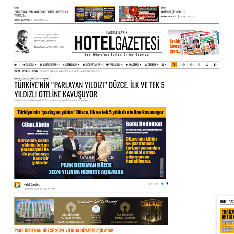 Türkiye’nin “parlayan yıldızı” Düzce, ilk ve tek 5 yıldızlı oteline kavuşuyor PARK DEDEMAN DÜZCE 2024 YILINDA HİZMETE AÇILACAK Turizm sektörünün köklü markası Dedeman Hotels & Resorts International ile Düzce’nin önde gelen şirketlerinden Algün İnşaat’ın iş birliğiyle faaliyete geçecek Park Dedeman Düzce için imzalar atıldı. Şehrin ilk ve tek markalı oteli olacak Park Dedeman Düzce, 300 milyon TL yatırım ile hayata geçecek. Otel, hem iş ve gezi amaçlı seyahat edenlerin hem de bölgenin ihtiyaçlarını karşılayacak. Türk turizminin ilk uluslararası otel zinciri Dedeman Hotels & Resorts International, gerçekleştirdiği yatırımlarıyla sektörün gelişimindeki rolünü sürdürüyor. Düzce’nin gelişimine ve modern bir kent olmasına büyük katkılar sunan, bu güne kadar Düzce’de yaptığı projelerle 5000’den fazla aileyi ev sahibi yapan Algün ve Dedeman arasındaki iş birliği ile hayata geçecek Park Dedeman Düzce, ilin ilk ve tek 5 yıldızlı marka oteli olacak.