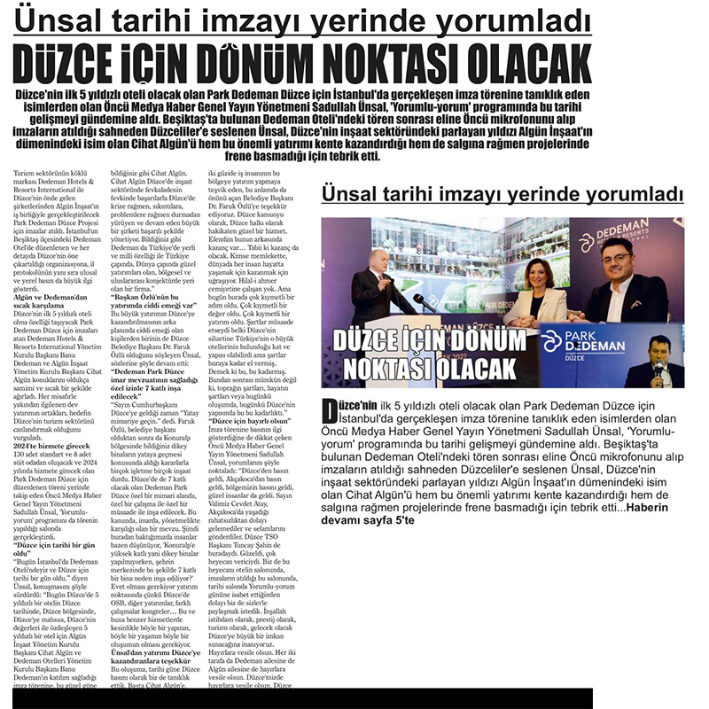 Unsal tarihi imzayı yerinde yorumladı Düzce’nİn ilk 5 yıldızlı oteli olacak olan Park Dedeman Düzce için İstanbul’da gerçekleşen imza törenine tanıklık eden isimlerden olan Öncü Medya Haber Genel Yayın Yönetmeni Sadullah Unsal, ‘Yorumluyorum’ programında bu tarihi gelişmeyi gündemine aldı. Beşiktaş’ta bulunan Dedeman Oteli’ndeki tören sonrası eline Öncü mikrofonunu alıp imzaların atıldığı sahneden Düzceliler’e seslenen Unsal, Düzce’nin inşaat sektöründeki parlayan yıldızı Algün İnşaat’ın dümenindeki isim olan Cihat Algün’ü hem bu önemli yatırımı kente kazandırdığı hem de salgına rağmen projelerinde frene basmadığı için tebrik etti..